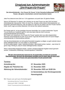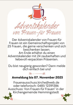 Für den Lebendigen Adventskalender 2025 sind noch Termine frei. Bitte melden bei Susanne Martens: 0152 0742297